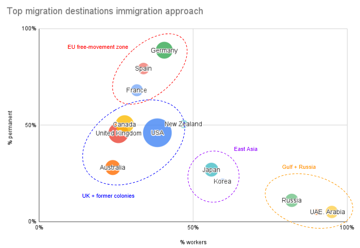 Up is permanent migrants, down is temporary. Right is work-driven migrants, left is not (family, students, refugees). Size of bubble is how many migrants accepted per year (1)