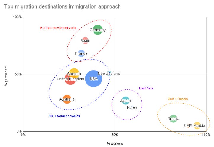 Below is my attempt to map how the world’s top immigration destinations have answered these two questions: