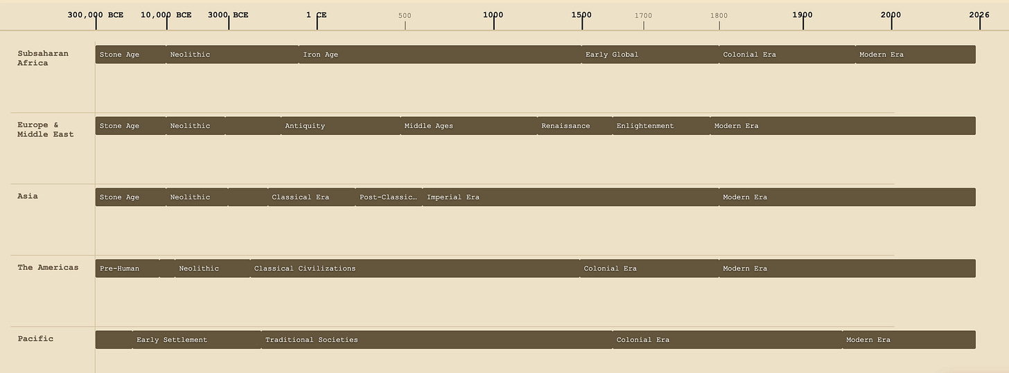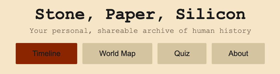 Stone, Paper, Silicon is a personal archive for hobby historians. It is NOT a complete timeline of humanity, but rather a basic and flexible framework into which you can use to slot in historical knowledge as you learn.