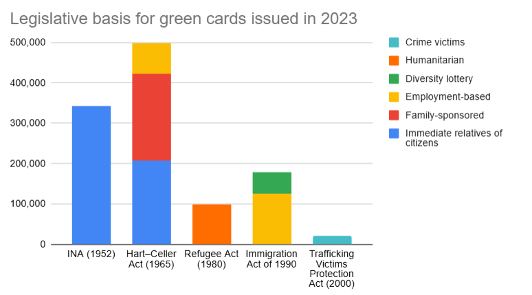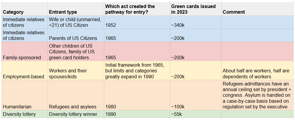 I wanted to double-click Jeremy’s data and see which laws enable which categories of green cards, to get my head around what legislation actually drives our high-skilled immigration.