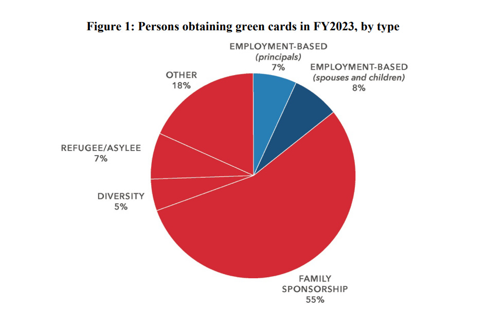 Jeremy Neufeld has a very helpful chart that clearly illustrates this point. Only ~7% of green cards are allocated on the basis of employment.