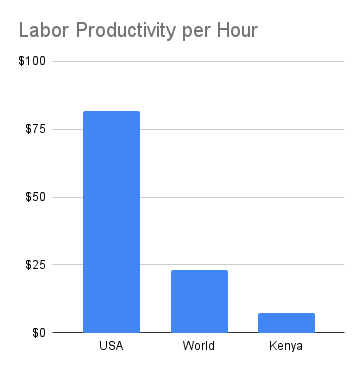 The average US worker produces $82 per hour, vs $7 per hour in Kenya and $23 per hour globally.